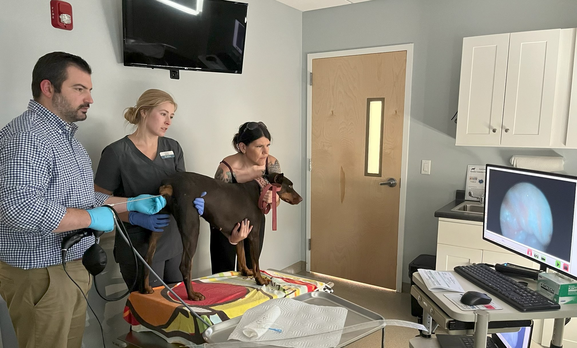 Transcervical Insemination (TCI): Using a rigid scope, a catheter is placed through the opening of the cervix. Semen is passed through the catheter into the middle of the cervix or into the uterus. This technique is well tolerated by most dogs, but is technically challenging. In rare cases, especially in certain breeds, the cervix is oriented in such a way that catheterization is not possible. The uterus is NOT visualized with the TCI scope.