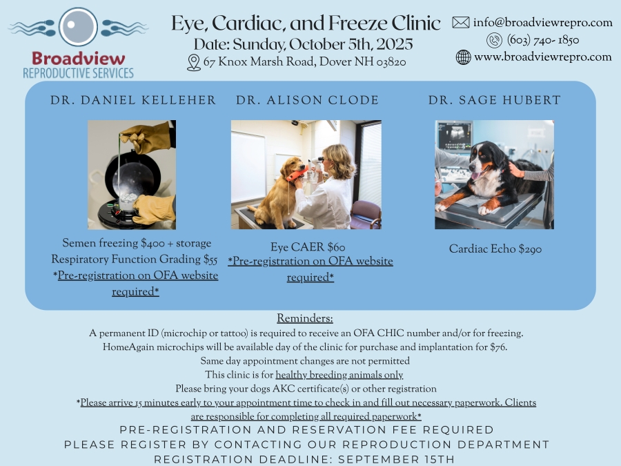We are pleased to have breeding clinics at our hospital. We bring in a board certified ophthalmologist and cardiologist to assist our reproductive services team in providing you with an easy opportunity to get a eye exam and / or cardiac echo completed in a very timely manner. Pre-registration is required to be as mindful of your time as possible. Sorry, additional dogs may not be added the day of the clinic. Please call us with any questions or to register.